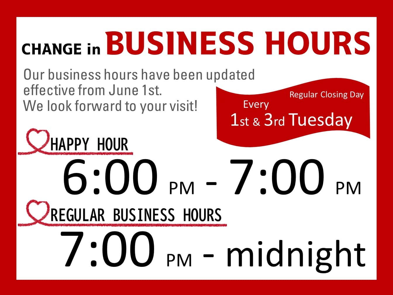 - Regular Hours : 19:00-24:00 (Last Order at 23:30)